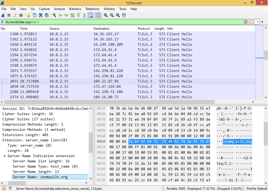 However, even in scenarios where there is genuinely no browsing data left behind locally, this doesn’t mean that there is no way for it to be recovered. The data will still exist over the network. When a user visits most websites, their web traffic will be encrypted with HTTPS, but not all of it is encrypted. Some metadata remains unencrypted because it needs to be routed properly. One key element of this metadata includes the name of the website which is exchanged during the TLS handshake. To demonstrate this, I ran Wireshark (a network sniffing software) on the virtual machine visiting zoomquilt.org through the private browsing feature. I’ve filtered the Wireshark output to only show the TLS protocol to make it easier to navigate. This shows a network log from my visits to each website.