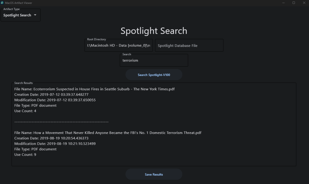 The feature I’m most proud of is the Spotlight-V100 searching tool. The Spotlight-V100 file is an file found on MacOS that is used to index files created by MacOS’s file search feature, Spotlight. This file contains an index of nearly every file on the computer along with crucial metadata. Using this tool, all you need to do is specify that disk image that the Spotlight-V100 file is located on. Alternatively, you can input the Spotlight-V100 file directly if you’ve already extracted it. Then, you can use the search box to enter a search term. Once you click the search button you will get a list of every file that included this search term along with the metadata of those files.