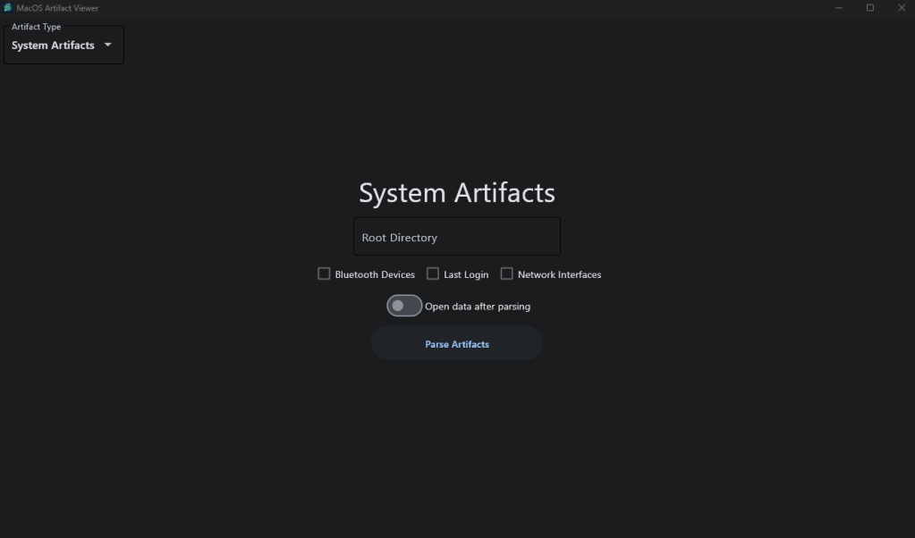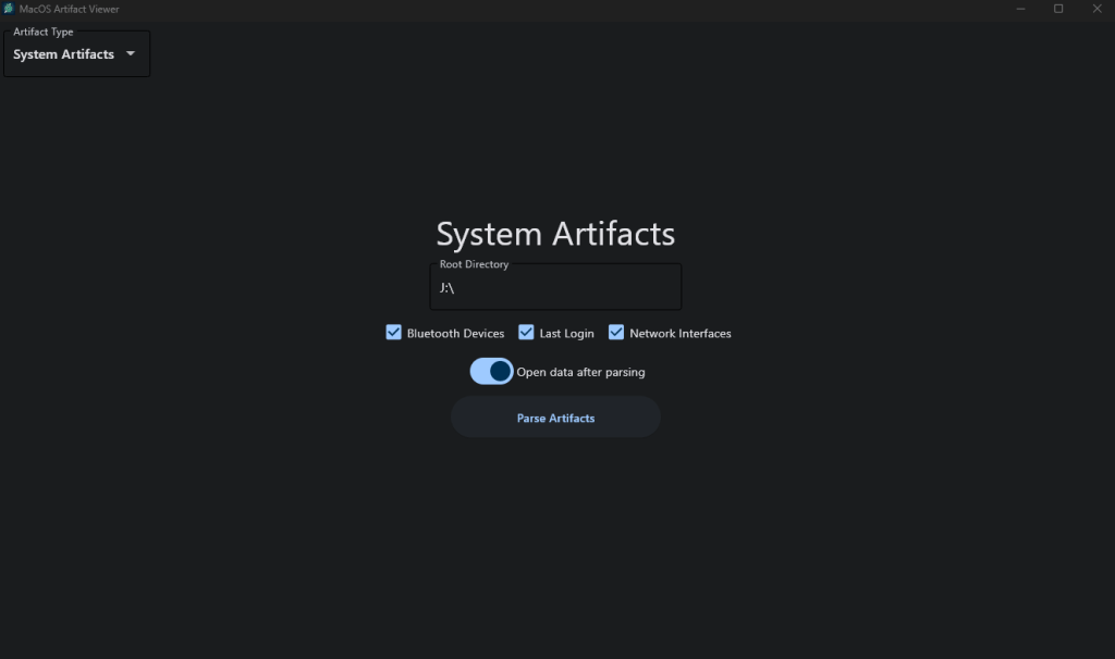 For each page you’ll need to first specify the root directory of the MacOS disk image you are analyzing. As of now, this program can not analyze live systems. So, you will need to mount a MacOS disk image before starting the analysis. After you’ve selected the root directory, the rest is pretty straight-forward. Just select the artifacts you want to parse and the program does the rest of the work for you. You can use the slider to open the results instantly, otherwise the results will be saved to the output directory you specified on the “settings” page. Below is a quick example of me running this on some system artifacts on a MacOS disk image I acquired from Digital Corpora.