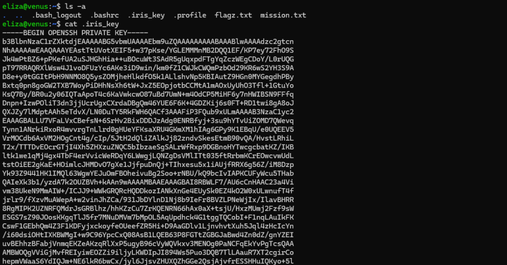 While logged into Lucia’s account, if you print the contents of the “dict.txt” file, you will find a hidden flag if you scroll far enough.