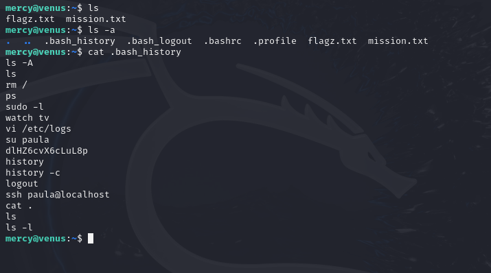 The .bash_history file is a file on Linux systems that shows recent commands typed by a user. We can find the password for Paula’s account here.