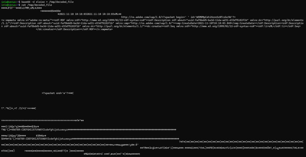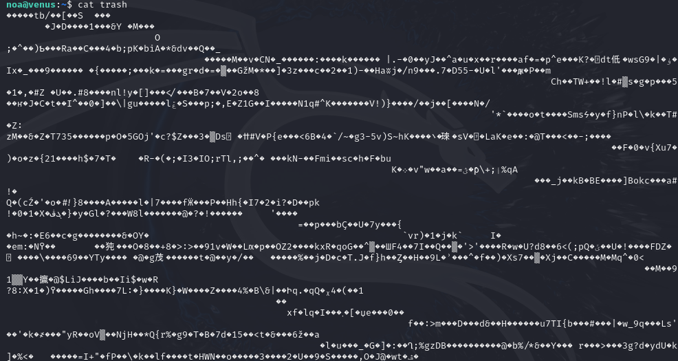 The password is located somewhere in the file called “trash”. But printing the contents of this file reveals that it won’t be so simple to find it at a glance.