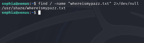 - “whereismypazz.txt”: specifies the name of the file we’re searching for