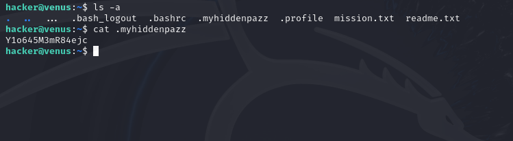 To solve this one, you’ll need to use the command “ls -a”, which will list all files in the current directory (including hidden ones). From here, you will find a file called “.myhiddenpazz”, which you can print the contents of using the “cat” command. This will print the flag.