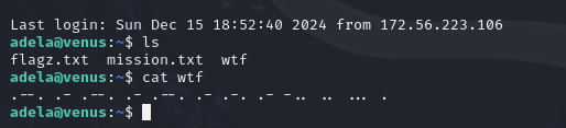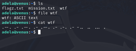 After a while of trying things out, I ran out of ideas and decided to look up some help. The solution to this one is something I’m not sure I would have figured out on my own. Or if I did it would have taken a while. The solution is to log back into Adela’s account and print the morse code content of the “wtf” file again. But this time, you don’t translate the morse code. You just take the morse code string exactly as it is and that is the password.