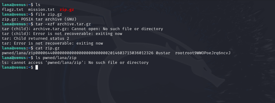 With this one, the password was stored in a file called “zip.gz”. Trying to unzip it was causing some issues, however I was still able to view the password in the zip file just by using “cat” to print the contents of the file directly.