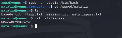 This tells us that Anna can use sudo to impersonate Natalia, and the only command she can run with sudo is “/bin/bash”. This is perfect since this command will open a shell. So we can open an interactive shell as Natalia by running the following command: