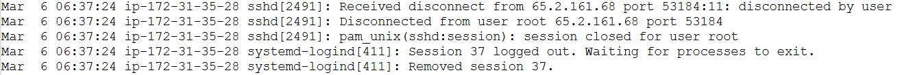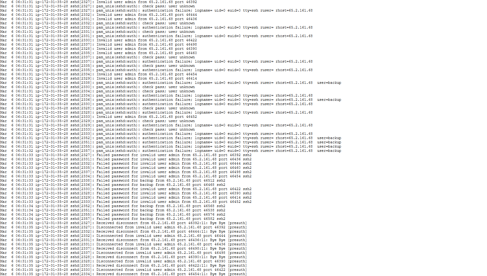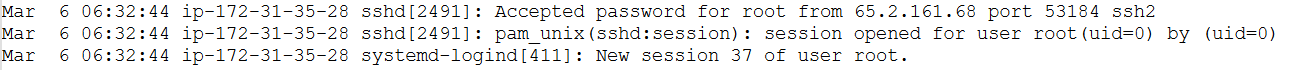 At 6:31:40 the system logged “Accepted password for root from 65.2.161.68”.