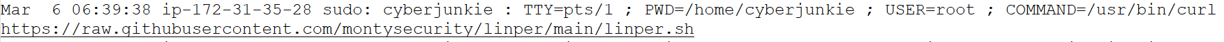 The log below shows the “cyberjunkie” user using the curl command to download a script called “linper.sh”.