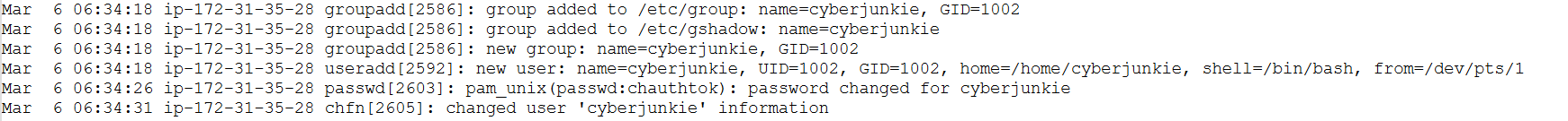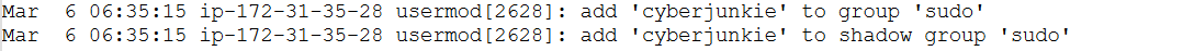 The following logs show that the user account “cyberjunkie” was created, and shortly afterward the account was given higher privileges by being added to the group, “sudo”.