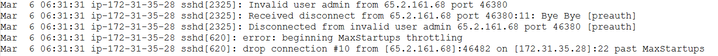 The logs show the first sign of attack coming from the IP address 62.2.161.68 at 6:31:31. We see that they first try to connect as the user “admin”, which fails. Then immediately afterward, we see that the log reads “error: beginning MaxStartups throttling”. This is done because too many simultaneous connections are occurring, so the server is dropping some of them. This is the first clear sign of a brute force attack.