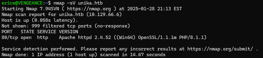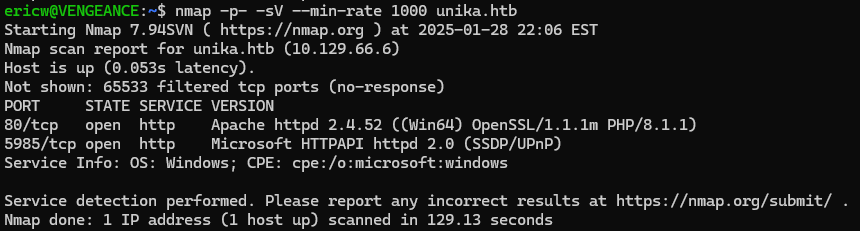 Since we know that file inclusion is possible, we can attempt to use RFI to get access to the server. If we use nmap to do a deeper scan, we can also see that this server has a service running on port 5958, which is often used for a remote administration service called WinRM.